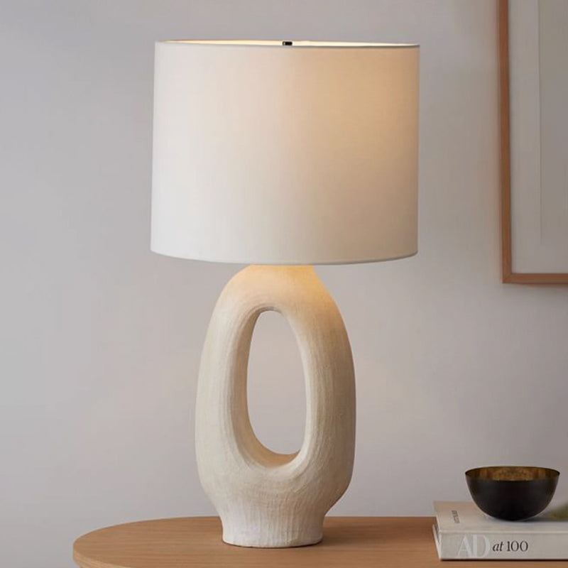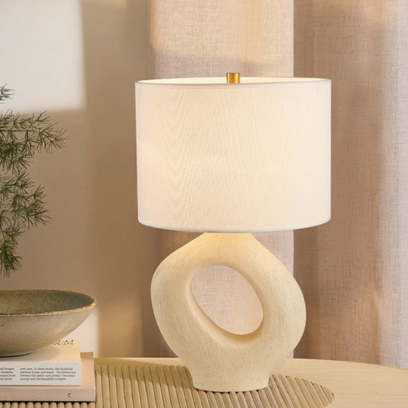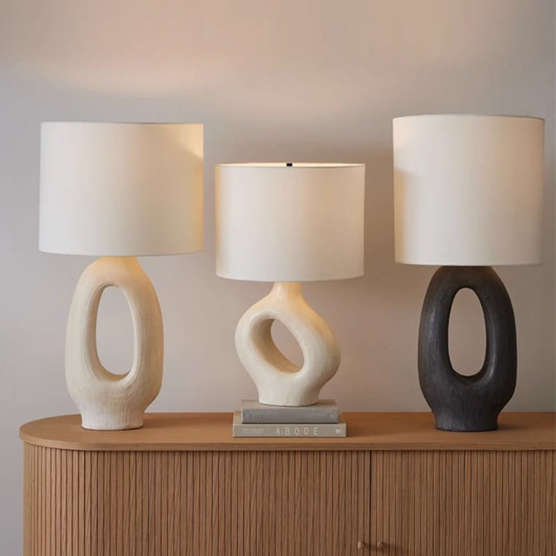 This bedside table lamp features an irregular resin base with a handcrafted, vintage-style finish, adding a distinctive artistic touch. Its textured surface and creative design bring character and warmth to any home decor style.